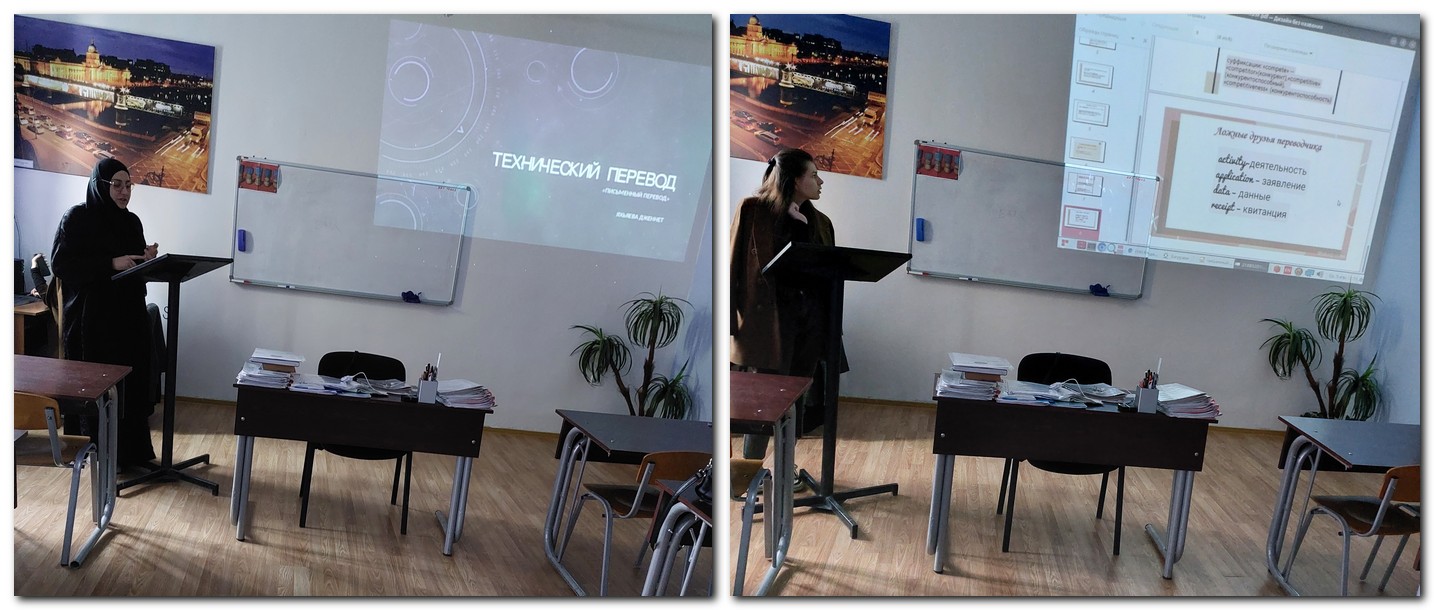 Студенты выступили с докладами — презентациями по исследуемым актуальным вопросам кружка: «Сложности перевода препозитивных атрибутивных словосочетаний с английского языка на русский», «Артикль и его переводческие соответствия», «Проблемы перевода герундия и герундиальных конструкций», «Особенности перевода причастия и причастных конструкций», «Перевод инфинитива и инфинитивных конструкций с английского языка на русский».