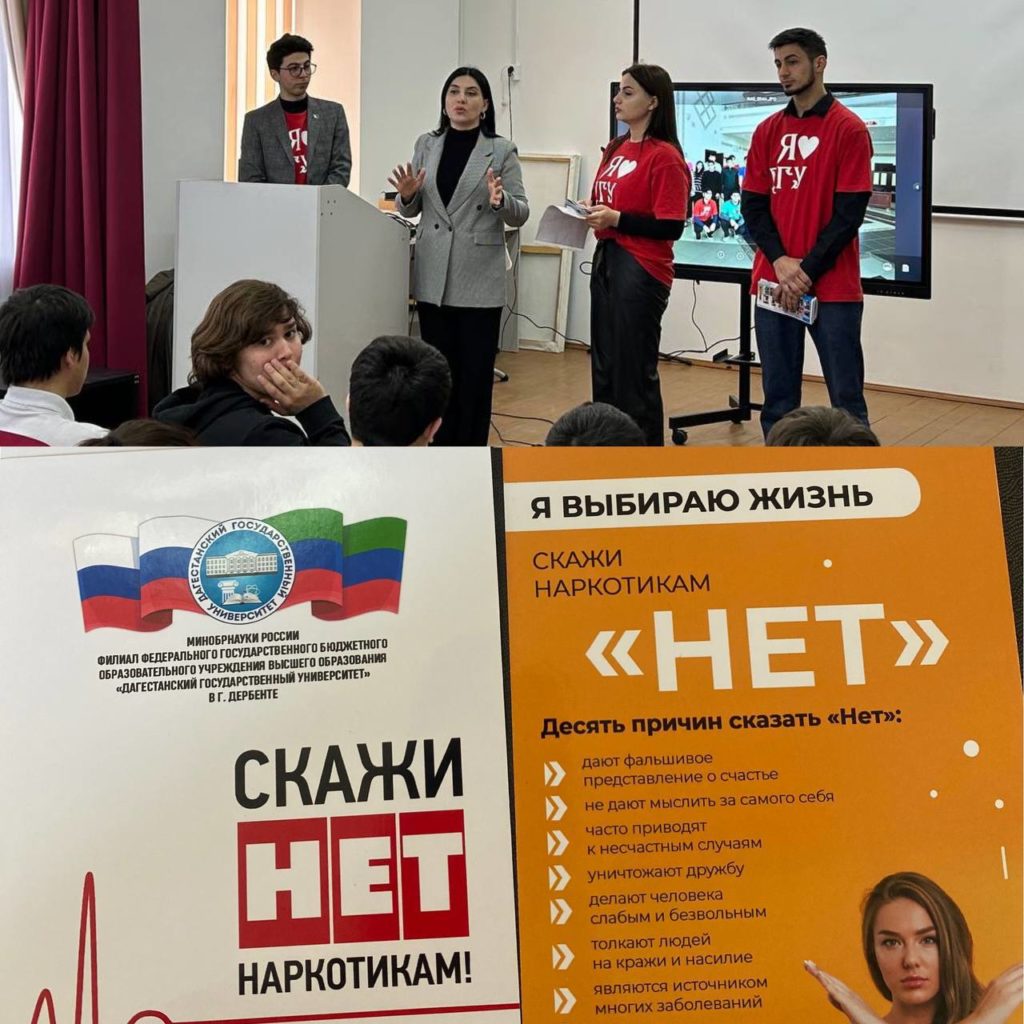 6.04.2023 г, в рамках Всероссийской межведомственной операции «Дети России-2023» по реализации Стратегии гос. антинаркотической политики, зам. дир. по ВиС работе Казиева С. А. совместно с активистами филиала ДГУ в г. Дербенте провели эвристическую беседу «Скажи НЕТ наркотикам!» с учащимися МБОУ СОШ N1 г. Дербента. Беседа была направлена на формирование представления о негативном воздействии наркотиков на физическое здоровье человека и его социальное благополучие. Студенты также рассказали уч-ся о работе волонтерского отряда филиала «Нет наркотикам», был продемонстрирован ролик о последствиях потребления психотропных средств. В завершение для информационной поддержки мероприятия были розданы буклеты антинаркотического содержания «Я выбираю жизнь!», «Скажи НЕТ наркотикам!»