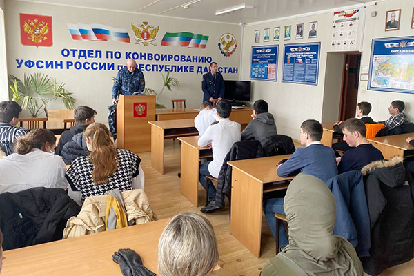 В рамках встречи заместитель начальника ФКУ ОК УФСИН России по Республике Дагестан Расул Омаров рассказал учащимся о тонкостях работы в конвойной службе, а также о том, что необходимо знать каждому человеку, решившему посвятить свое будущее с работой в уголовно исполнительной системе.