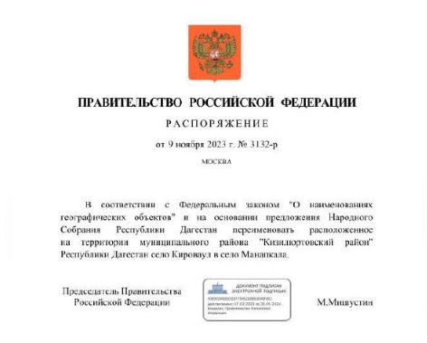 Председатель Правительства России Михаил Мишустин подписал распоряжение о переименовании Кироваула в Кизилюртовском районе Дагестана в село Манапкала.