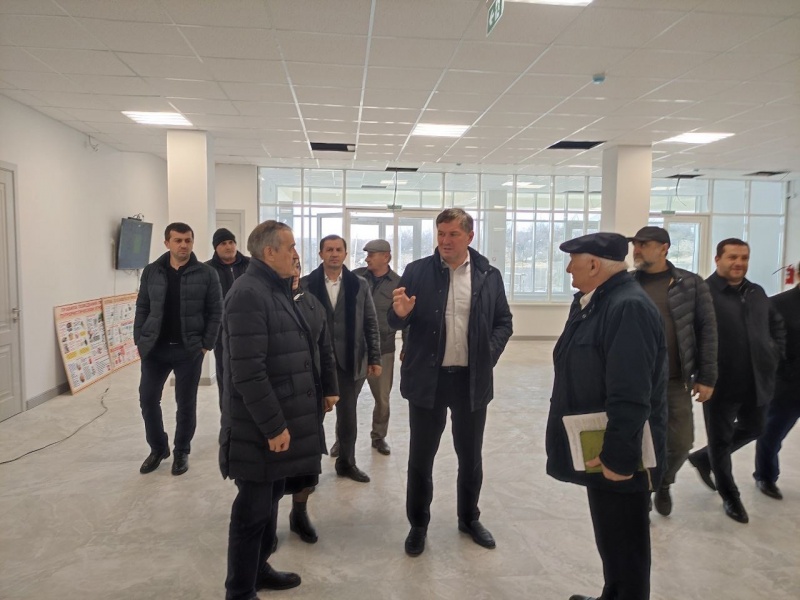 Депутат Госдумы Нурбаганд Нурбагандов в сопровождении главы района Махмуда Амиралиева осматривает новую школу на 700 мест в с. Карабудахкент.