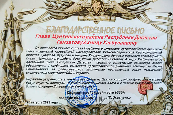 В тексте письма говорится: «От лица всего личного состава 1 гаубичного самоходного-артиллерийского дивизиона 136-й отдельной гвардейской мотострелковой Уманско-Берлинской Краснознаменной, орденов Суворова, Кутузова и Богдана Хмельницкого бригады выражаем благодарность Главе Цунтинского района Республики Дагестан Гамзатову Ахмеду Хасбулаевичу за достойного сына Республики Дагестан сержанта заместителя командира взвода обеспечения 1 гаубичного самоходно-артиллерийского дивизиона Магомедова Расула Рамазановича за добросовестное выполнение поставленных задач повышенной сложности на территории СВО и Украины».