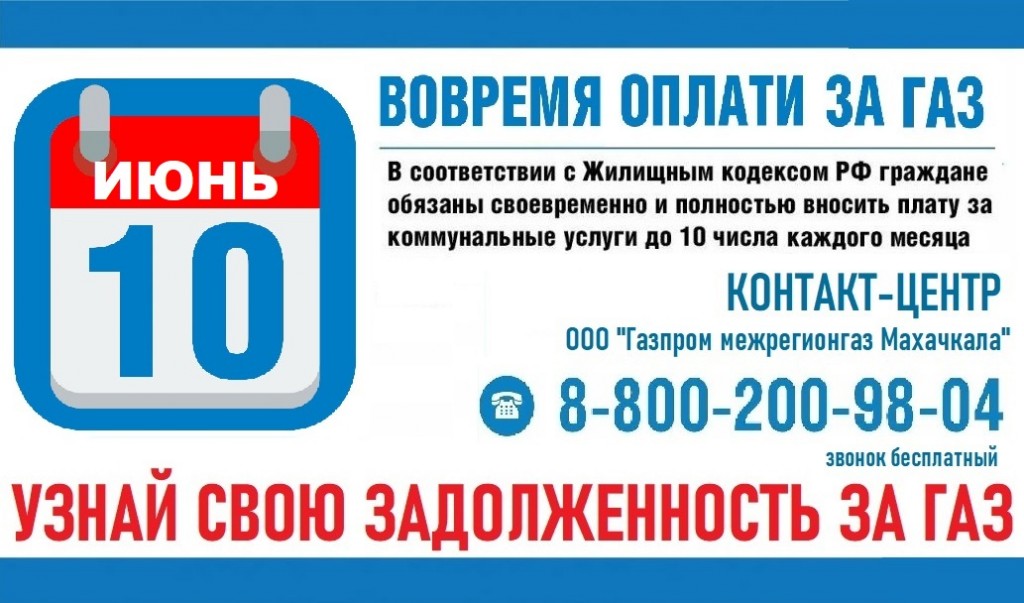 Поставщик газа на территории Республики Дагестан – «Газпром межрегионгаз Махачкала» напоминает, что оплату за потребленный газ необходимо провести до 10 числа.
