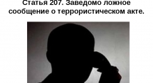 В настоящее время достаточно часто в СМИ появляется информация о ложных сообщениях о готовящихся терактах. Законодательством Российской Федерации уголовная ответственность за указанные правонарушения предусмотрена, в частности, статья 207 УК РФ определяет, что заведомо ложное сообщение о готовящемся взрыве, поджоге или иных действиях, создающих опасность гибели людей, причинения значительного имущественного ущерба либо наступления иных общественно опасных последствий наказывается штрафом в размере до двухсот тысяч рублей или в размере заработной платы или иного дохода осужденного за период до восемнадцати месяцев, либо исправительными работами на срок от одного года до двух лет, либо арестом на срок от трех до шести месяцев, либо лишением свободы на срок до трех лет.