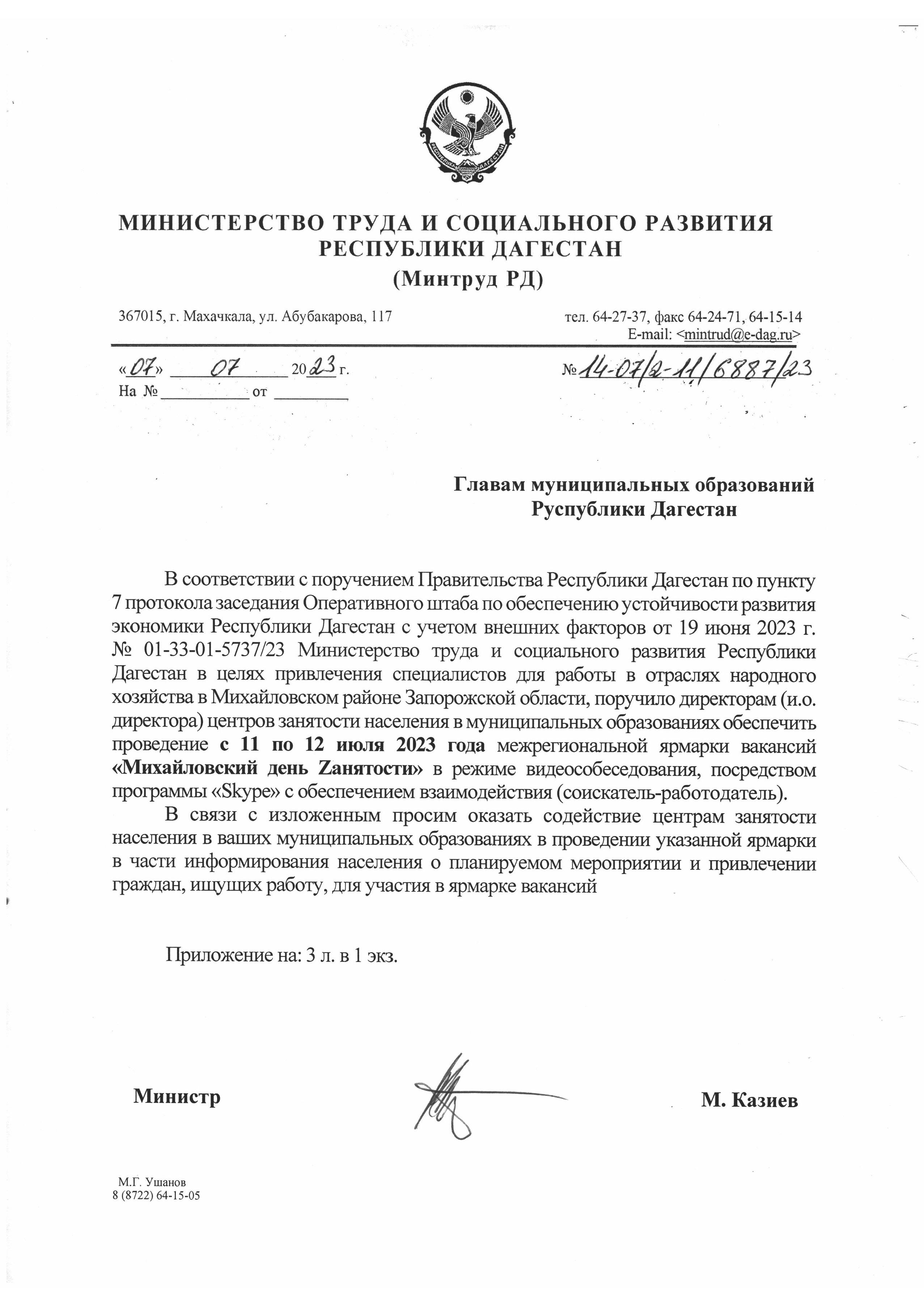 Министерство труда и социального развития Республики Дагестан в целях привлечения специалистов для работы в отраслях народного хозяйства в Михайловском районе Запорожской области, поручило директорам (и.о. директора) центров занятости населения в муниципальных образованиях обеспечить проведение с 11 по 12 июля 2023 года межрегиональной ярмарки вакансий «Михайловский день Zaнятости» в режиме видеособеседования, посредством программы «Skype» с обеспечением взаимодействия (соискатель-работодатель).