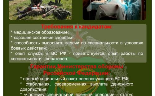 Требования к кандидатам: медицинское образование, хорошее состояние здоровья, способность выполнять задачи по специальности в условиях боевых действий. Гарантируется полный социальный пакет военнослужащего Вооружённых сил Российской Федерации.