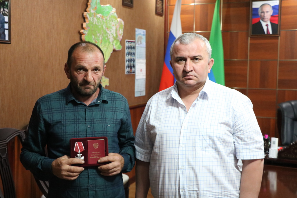 Сегодня в администрации МР «Казбековский район» глава муниципалитета Гаджимурад Мусаев вручил отцу погибшего участника СВО Шангере Навурбиева из селения Алмак высокую государственную награду – Орден Мужества, которого военнослужащий был удостоен посмертно.