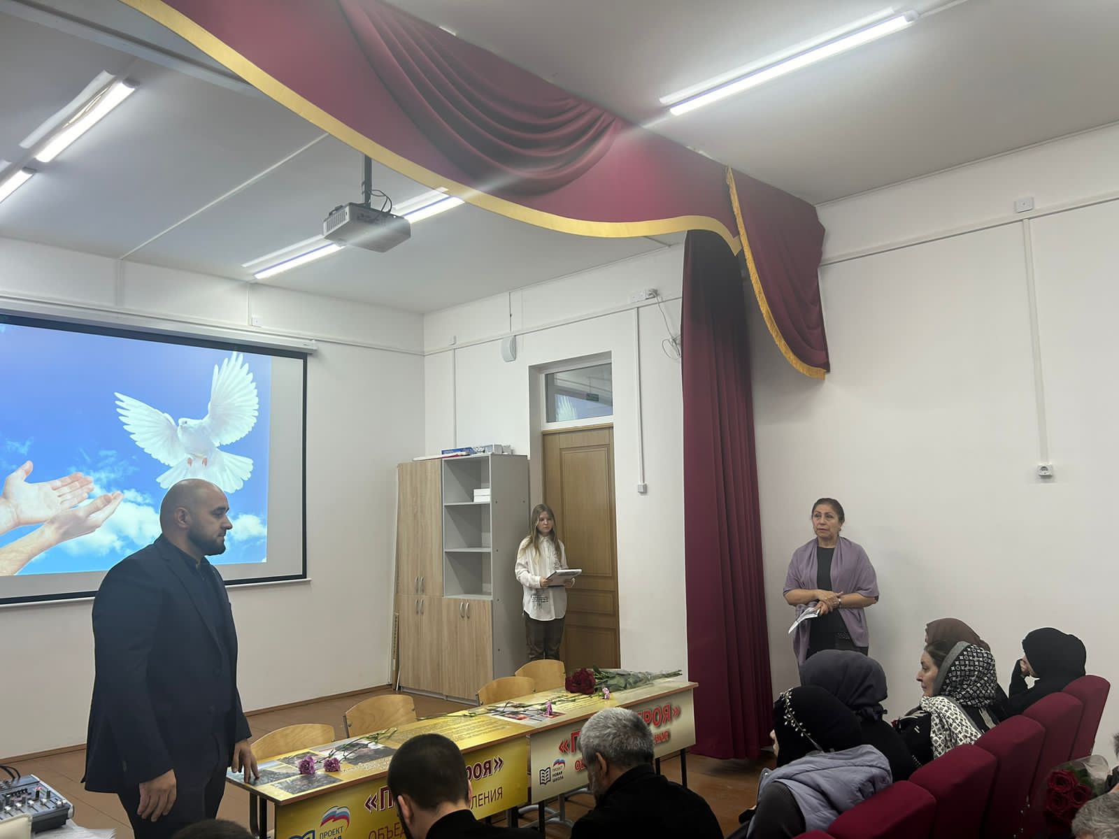 На мероприятии выступила директор школы Наида Исмаилова , и предоставила право открыть парту героя членам семей погибших.