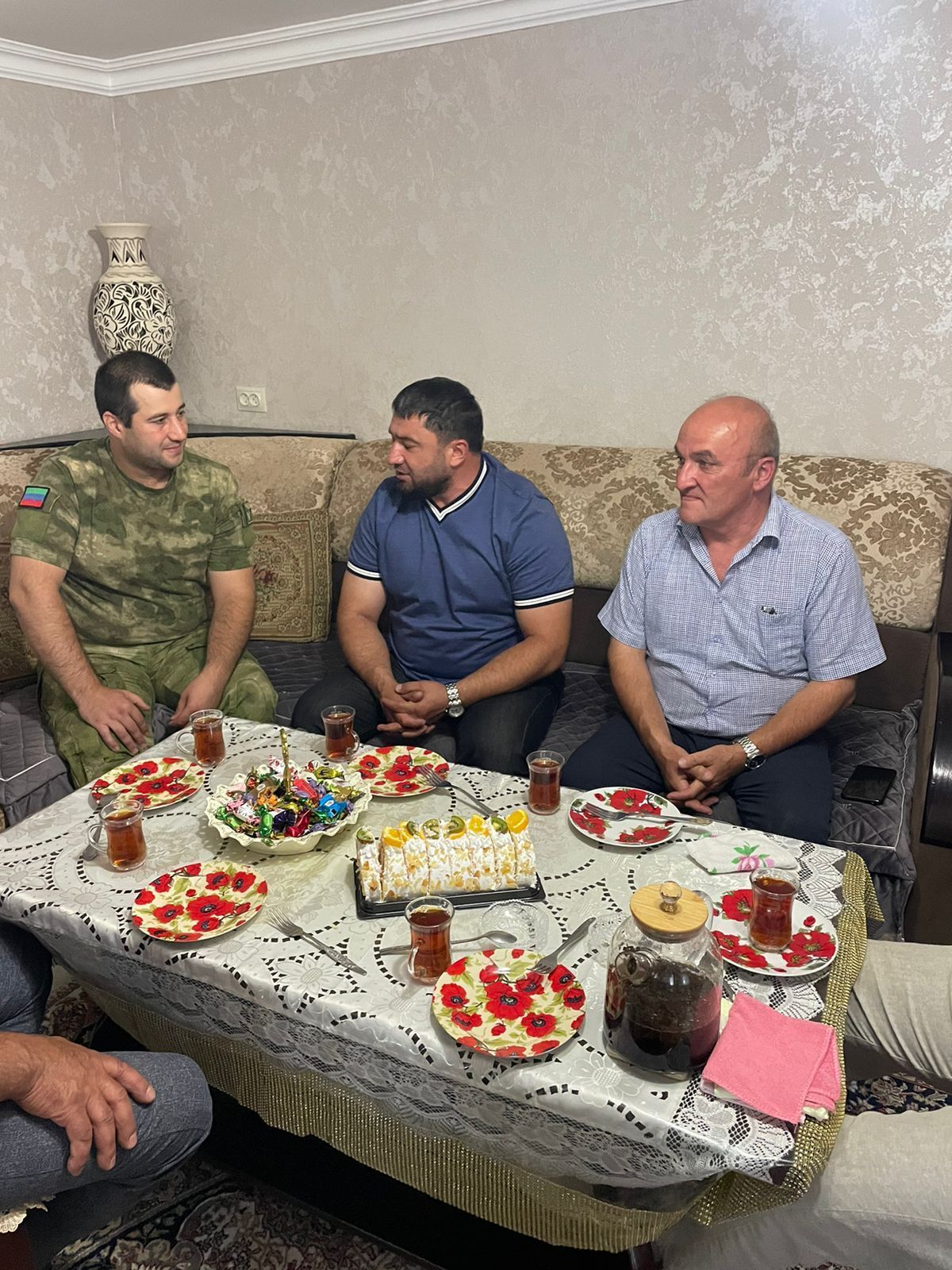 Глава АСП Надыр Эфендиев со своим заместителем Маликом Ахмедовым навестили командира батальона, капитана Эдуарда Ахмедова, который во время отпуска по реабилитации после тяжелого ранения находится дома в родном селе Ашага-Стал.