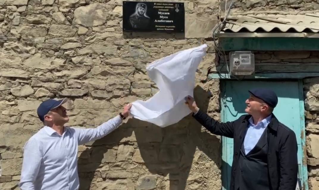 Затем глава района Мухидин Магомедов и близкий друг Мусы Шамиль Магомедов сняли полотно с мемориальной доски.