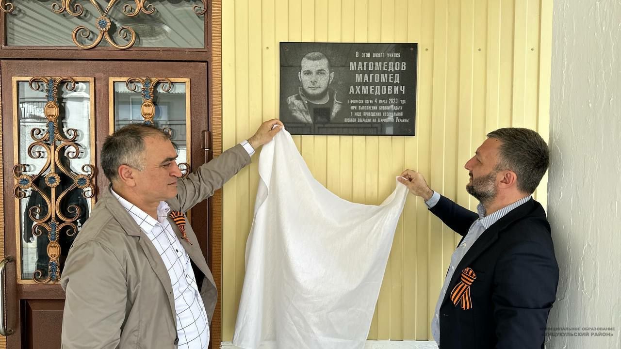 Увековечив память героя разместили «Доску памяти» с портретом героя СВО на стене у входа в корпус школы, где учился Магомед Магомедов.