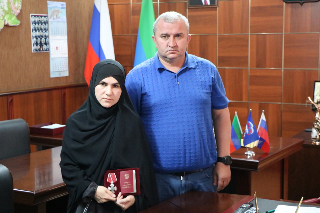 Сегодня в кабинете главы Казбековского района Гаджимурада Мусаева в торжественной обстановке вручили Орден Мужества вдове погибшего участника СВО Магомеда Саадулаева.