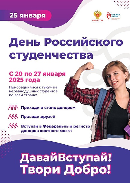 Донорское движение среди молодежи охватывает все регионы Российской Федерации. Сотни вузов и ссузов страны активно проводят донорские акции на своих площадках. Студенты, достигшие 18-летнего возраста на момент проведения акции, получат уникальную возможность стать донорами и впервые сдать кровь. А те, кто уже имеет опыт донорства, смогут повторно помочь нуждающимся и пополнить ряды регулярных доноров крови. Участники также смогут вступить в Федеральный регистр доноров костного мозга и отметить День российского студенчества в донорском кресле, совершая важный и благородный поступок.