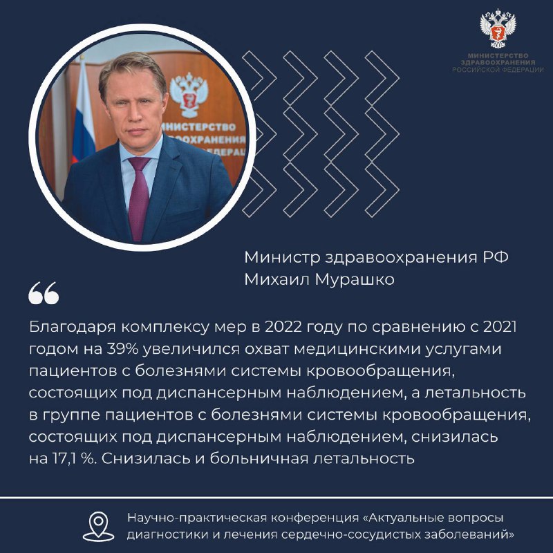 Министр здравоохранения РФ Михаил Мурашко в своем приветствии организаторам и участникам научно-практической конференции «Актуальные вопросы диагностики и лечения сердечно-сосудистых заболеваний» отметил,