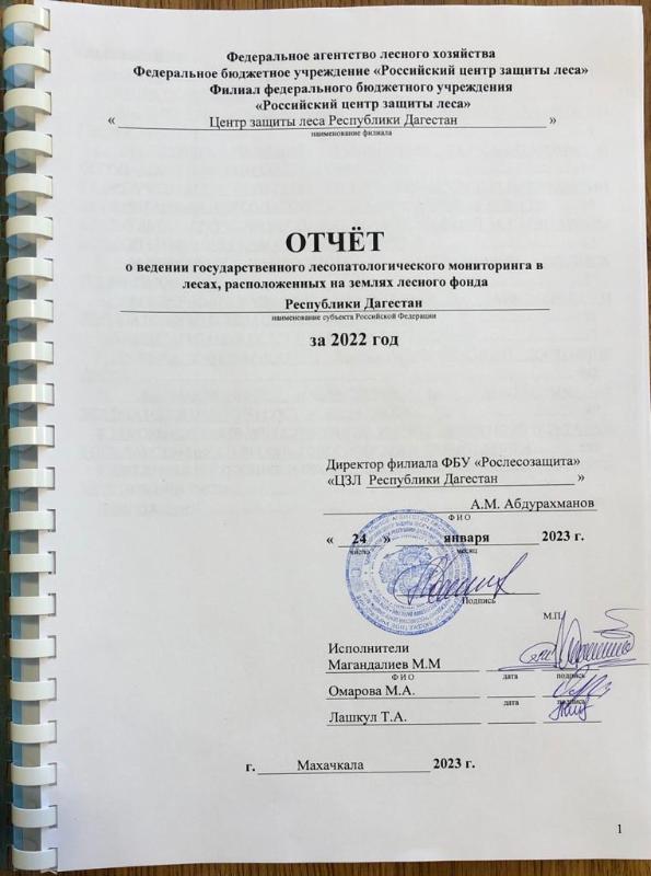 Отчет о ведении государственного лесопатологического мониторинга на землях лесного фонда Республики Дагестан за 2022 год, утвержденный директором филиала, отправлен в ФБУ «Рослесозащита».